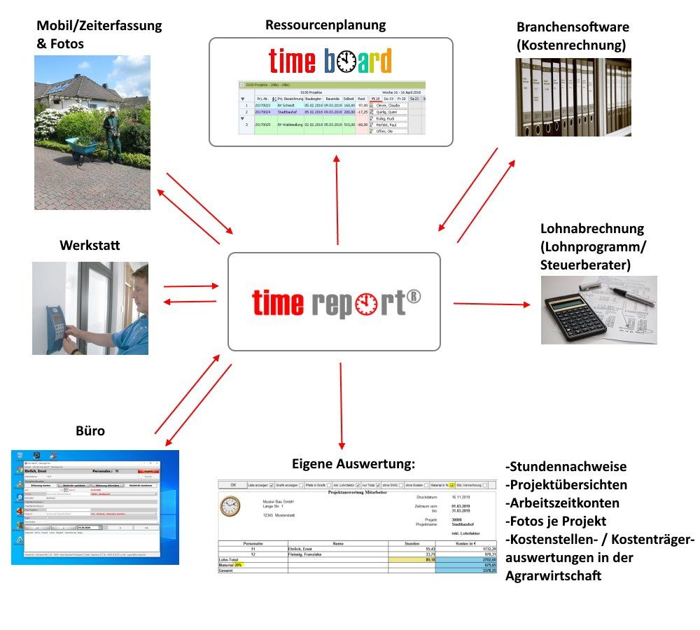 Dank der modularen Struktur kann time report ® auf die Erfordernisse des Anwenders zugeschnitten werden. Nicht jeder benötigt eine Erfassung in der Werkstatt oder im Büro, eine Übergabe der Daten zum Steuerberater oder zu einer Branchensoftware. Der Anwender hat aber die Sicherheit, dass er time report ® bei Bedarf an die Entwicklung seines Unternehmens anpassen kann. Generell gilt, dass auf einfache Art und Weise die Zeiten der Mitarbeiter schnell und einfach konkreten Projekten/Aufträgen zugeordnet werden. Dabei sind eine detaillierte Tätigkeitserfassung und eine Fotoverwaltung möglich. Die Kosten in der Verwaltung werden gesenkt und die Effektivität der Mitarbeiter wird erhöht. Mit dem zeitnahen Informationsgewinn kann das Unternehmen wichtige Wettbewerbsvorteile erzielen.